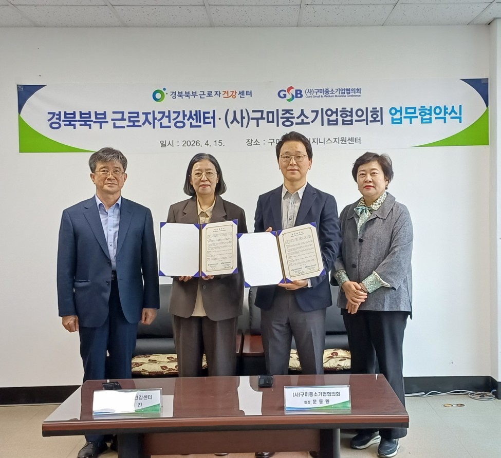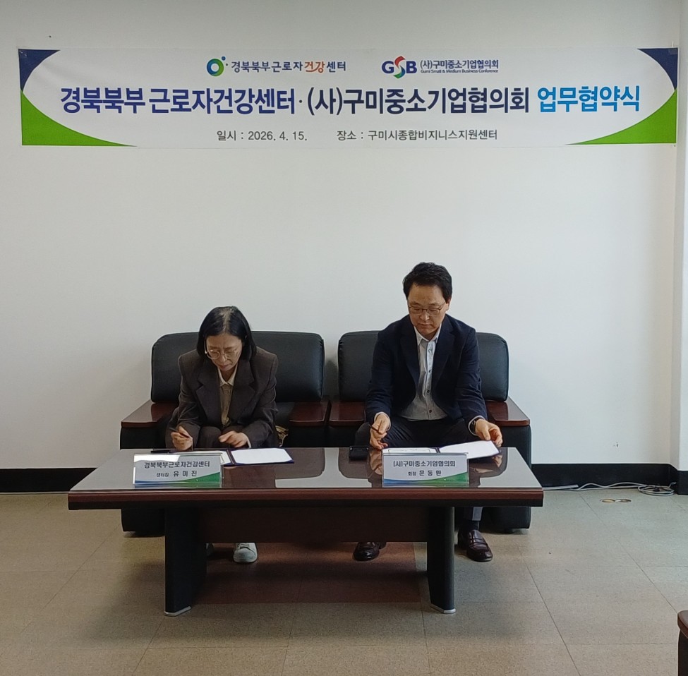 (사)구미중소기업협의회와 경북북부근로자건강센터는 15일 오후 3시, 구미시종합비즈니스지원센터에서 회원사 근로자의 건강증진과 근로환경 개선을 위한 업무협약을 체결했다.