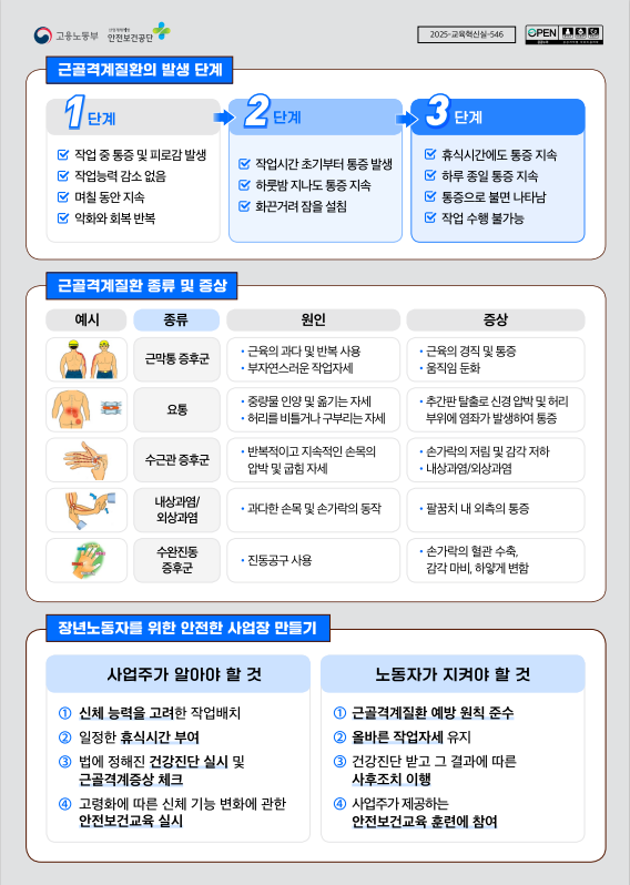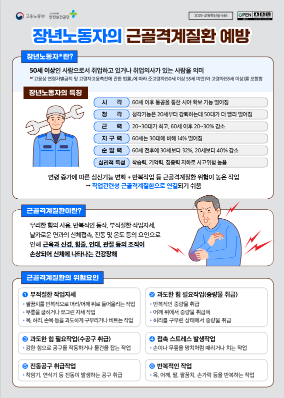 장년 노동자의 근골격계질환 예방 페이지 정보 작성자 관리자 조회20회 작성일 26-04-01 16:19 본문 출처: 산업안전포털: 산재예방 정보 > 안전보건 자료실 > 전체 자료 > OPS > 상세 | 산업안전포털 (kosha.or.kr) 목록